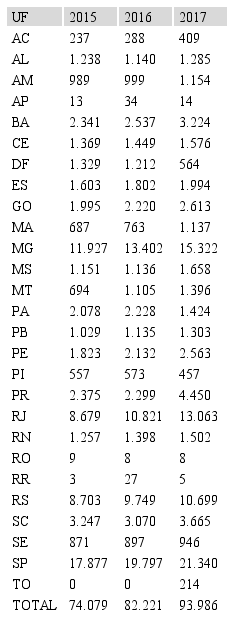 A Tabela 1 apresenta a evolução da trajetória deficitária no âmbito dos RPPS dos estados brasileiros entre os anos de 2015 e 2017 (Secretaria do Tesouro Nacional [STN], 2018). Tais dados reafirmam o entendimento de Braun (2014) de que há um problema de insustentabilidade dos regimes previdenciários estaduais não solucionado pelas reformas pretéritas, que enseja o emprego de recursos financeiros não vinculados à previdência.