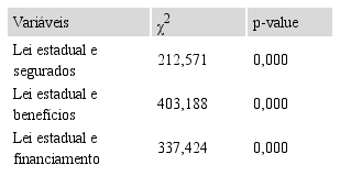 A análise dos resíduos padronizados permite caracterizar as categorias da variável “segurados” com as leis estaduais, considerando os valores positivos das colunas da Tabela 4, da seguinte maneira:
