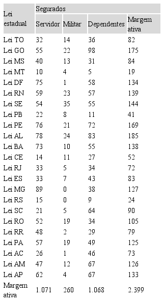 Após o levantamento da legislação estadual, foi realizada uma análise de conteúdo das leis mantidas na amostra, com vistas a identificar a frequência dos elementos correspondentes às variáveis qualitativas e suas respectivas categorias empregadas neste estudo: Variável “segurados”, com as categorias “servidor”, “militar” e “dependentes”; variável “benefícios”, com as categorias “aposentadoria”, “pensão”, “auxílio-doença”, “salário-maternidade”, “salário-família” e “auxílio-reclusão”; e variável “financiamento”, com as categorias “contribuição”, “fundo” e “compensação”.