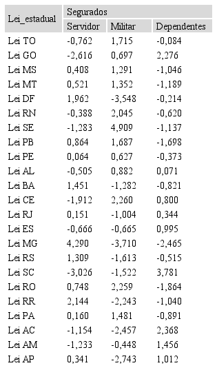 Um ponto importante desta análise diz respeito aos resíduos padronizados, também conhecidos como medidas de similaridade (Fávero et al., 2009). Os resíduos representam as diferenças entre as frequências esperadas e as observadas. Quando os valores são negativos, há uma indicação de menor associação entre as variáveis. Considerando que o objetivo deste estudo é identificar práticas de isomorfismo na legislação estadual que criou os respectivos RPPS, os resíduos padronizados, ou seja, as medidas de similaridades fornecem um razoável indicativo de tais práticas. A Tabela 4 apresenta os resíduos padronizados para as variáveis “lei estadual” e “segurados”.