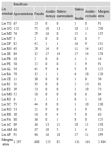a) Aposentadoria - catorze leis dos estados em ordem decrescente de importância: Tocantins, Pará, Pernambuco, Minas Gerais, Paraíba, Bahia, Santa Catarina, Mato Grosso, Rondônia, Mato Grosso do Sul, Distrito Federal, Rio Grande do Sul, Amazonas e Espírito Santo;