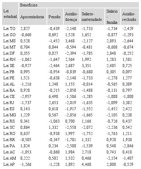 Em termos da variável “lei estadual”, a categoria dominante foi a lei do estado de Sergipe, que contribuiu com 0,159 da inércia da primeira dimensão. Na segunda dimensão, a categoria referente à lei do estado do Ceará foi a mais relevante, respondendo por 0,314 de sua inércia. Quanto à variável “benefícios”, a categoria dominante na primeira dimensão foi “auxílio-doença”, responsável por 0,378 da inércia, enquanto a categoria “pensão” respondeu por 0,394 da inércia da segunda dimensão.