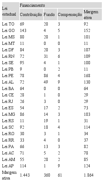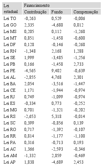 a) Contribuição - catorze leis dos estados em ordem decrescente de importância: Tocantins, Pará, Pernambuco, Minas Gerais, Paraíba, Bahia, Santa Catarina, Mato Grosso, Rondônia, Mato Grosso do Sul, Distrito Federal, Rio Grande do Sul, Amazonas e Espírito Santo;