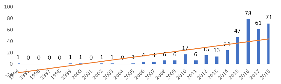 Inicialmente apresentamos a frequência de publicações por ano (Gráfico 1). Por meio do gráfico é possível observar que estudos sobre empreendedorismo social são recentes. Apesar do primeiro trabalho da busca ter sido publicado em 1994, até 2005 o número de publicações era baixo.