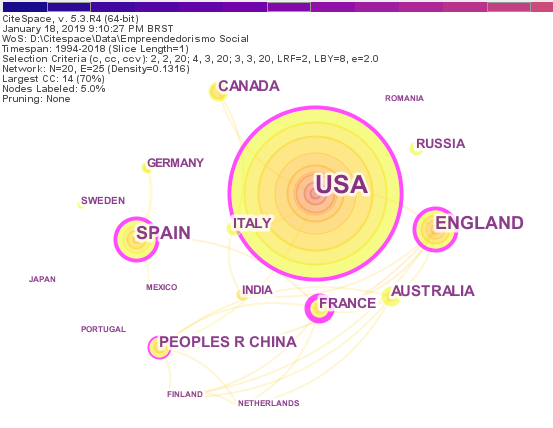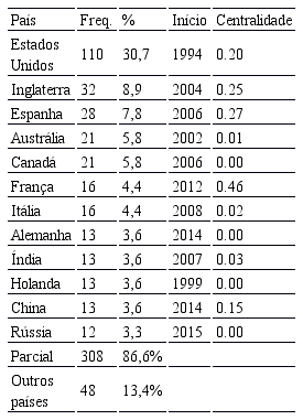 Em relação aos países, a Tabela 1 apresenta a frequência de publicação por país, o ano da primeira publicação e a centralidade. Os maiores destaques são Estados Unidos, Inglaterra, Espanha, Austrália e Canadá. Dos 15 países listados, 7 iniciaram a publicação em empreendedorismo social a partir de 2010. A partir disso, é possível inferir que o campo tende a crescer nos próximos anos, pois mais países estão pesquisando sobre o assunto. Isso pode reforçar e legitimar o tema, trazendo contribuições teórico-metodológicas de diferentes contextos.