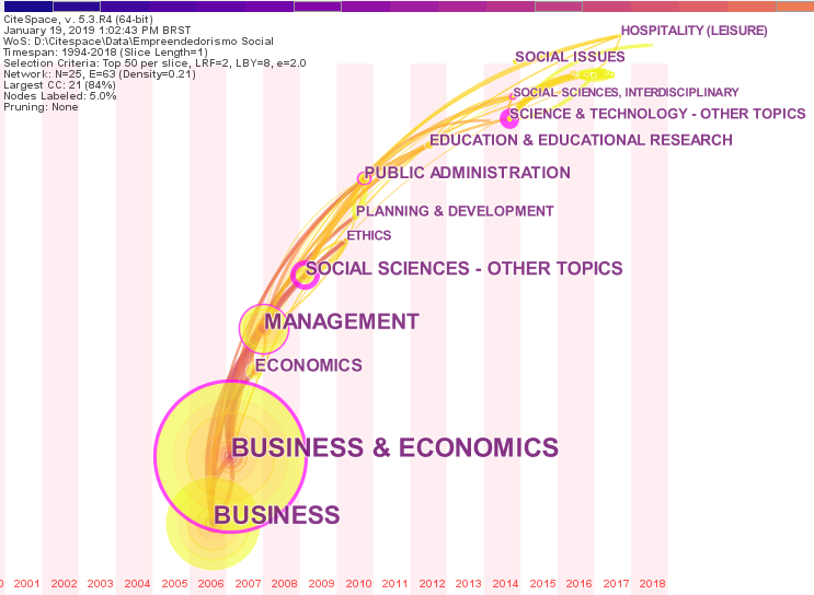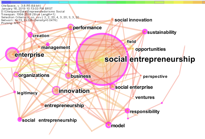 A palavra-chave com maior número de co-ocorrência é social entrepreneurship(217 co-corrências). Ressalta-se que a expressão aparece duas vezes na Figura 2. O arquivo utilizado no CiteSpace é um arquivo de texto gerado pela Web Of Science e nesse arquivo a expressão social entrepreneurship apareceu de duas formas diferentes, sendo uma delas com dois espaços entre os termos social . entrepreneurship, o que fez com que o CiteSpace reconhecesse como dois termos distintos. Adiante, é importante notar que muitas palavras inicialmente relacionadas ao empreendedorismo privado também aparecem como, por exemplo, enterprise (63), innovation (45), organization (32), opportunity (32), business (30), performance (23), management (21). Dessa forma, nota-se uma forte ligação entre o campo do empreendedorismo social e seu campo de origem. O empreendedorismo social ainda é conceituado a partir de suas diferenças em relação ao empreendedorismo privado, mas alguns conceitos são comuns aos dois campos.