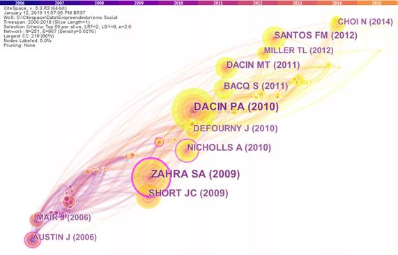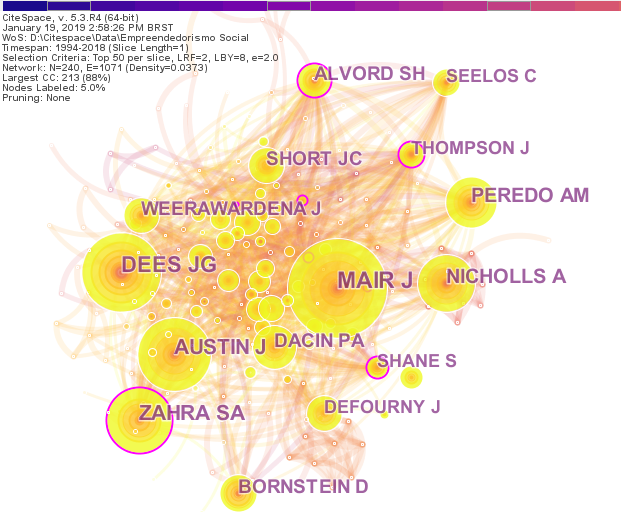 Alguns dos autores mais co-citados aparecem também com trabalhos entre os dez mais citados como, por exemplo, Johanna Mair (191 co-citações), Ana Maria Peredo (105), Peter Dacin (89), Jay Weerawardena (81) e Jeremy Short (75). Tal fato reforça a importância dos autores para o campo. Importante ressaltar que esses autores possuem outros trabalhos sobre empreendedorismo social. Apesar de não comporem o rol dos artigos mais citados, os demais autores são importantes. Alguns trabalham diretamente com empreendedorismo social como, por exemplo, J. Gregory Dees (150 co-citações). Uma busca no Google Scholar mostra que ele é autor de vários trabalhos sobre empreendedorismo social e seus trabalhos possuem grande número de citação. O mesmo acontece para James Austin (144 co-citações), Shaker A. Zahra (130), Alex Nicholls (114), David Bornstein (90), Sarah H. Alvord (75), Jacques Defourny (65), John L. Thompson (65), e Christian Seelos (62).