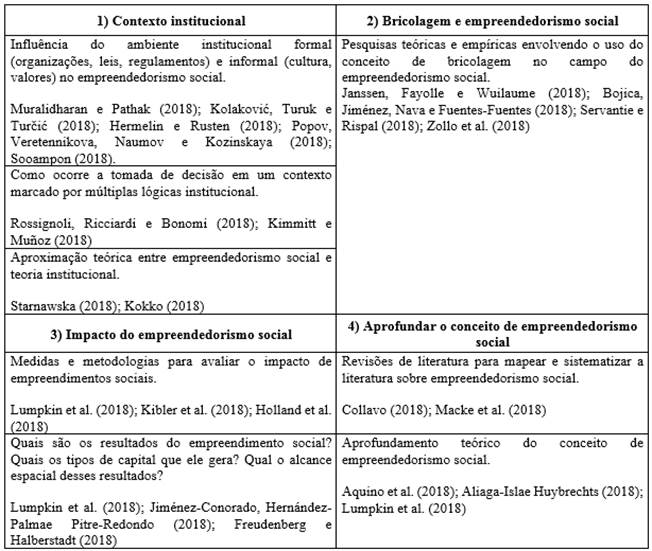 Para construir a agenda de pesquisas futuras (Quadro 1), foram analisadas as sugestões de pesquisas apresentadas nos artigos publicados em 2018. A agenda de pesquisa é recente e apresenta lacunas que podem motivar trabalhos futuros. Ressalta-se que não são todos os artigos que apresentam sugestões de pesquisa futura. Além disso, alguns artigos sugerem agendas que estão mais relacionadas com outros campos, tendo o empreendedorismo social apenas como pano de fundo. A agenda de pesquisa foi construída a partir de temas que apareceram com mais frequência, o que resultou em quatro tópicos de sugestões futuras.
