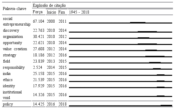 Em 2012 a expressão value creation teve explosão de citação. Atualmente, várias definições enfatizam a criação de valor social como um contraponto ao empreendedorismo privado, que tem como foco a criação de valor econômico (Mair & Marti, 2006). Mais recentemente, ocorre a explosão de citação do termo “vazio institucional” (institutional void) (Tabela 3). O institutional void mostra a relação entre instituições e o empreendedorismo social e busca entender como as instituições formais (organizações, normas, regulamentos) e informais (valores, culturas) influenciam, estimulam ou restringem o empreendedorismo social. Stephan, Uhlaner e Stride (2015) e Saebi, Foss e Linder (2019) afirmam que a motivação para o empreendedorismo social aumenta em ambientes com recursos escassos e onde as instituições governamentais são menos ativas, ou seja, onde há vazios institucionais.
