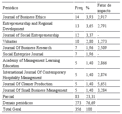 Em relação aos periódicos, a Tabela 4 apresenta aqueles que mais publicaram trabalhos da busca. A análise de periódicos mostra se determinado journal é referência em determinada temática, o que indicaria um caminho para buscas de referências. Nota-se (Tabela 4) que não existe uma grande discrepância de um determinado periódico, mas no conjunto os journals da tabela abaixo formam um conjunto interessante de fonte de dados para os pesquisadores que buscam estudar empreendedorismo social.