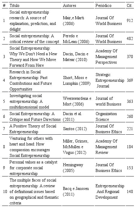 Importante destacar que os seis artigos mais citados da busca (Tabela 5) não estão publicados em nenhum dos journals listados na Tabela 4, contudo, ela aponta dois periódicos específicos para o empreendedorismo social, a saber, Journal of Social Entrepreneurship e Social Enterprise Journal, além de outros periódicos com perspectivas marginais como, por exemplo, Voluntas, Journal of Business Ethics e Journal Of Cleaner Production.