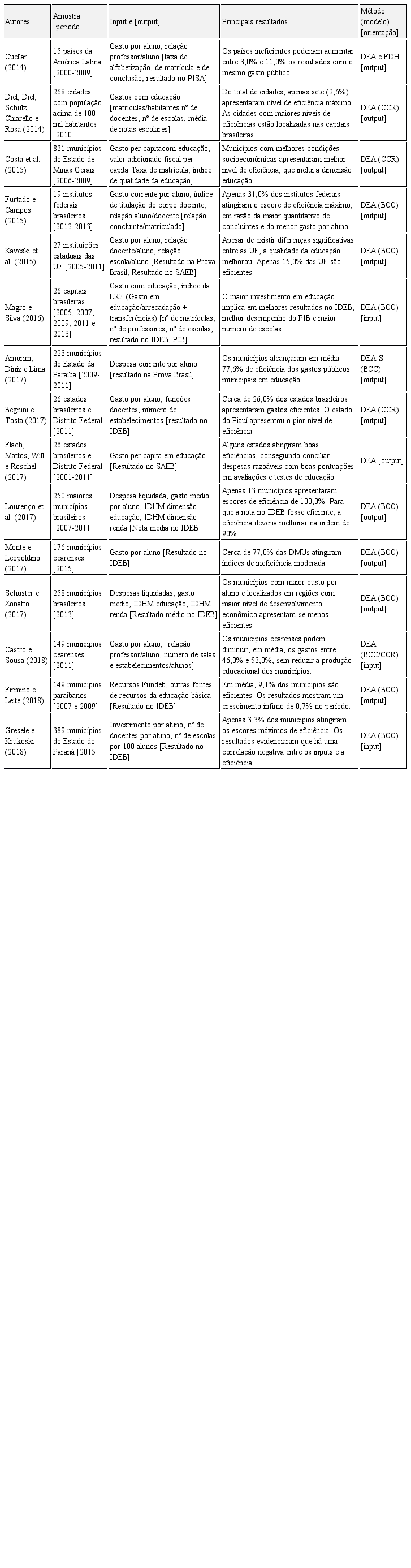 Nota: Em razão da quantidade de estudos sobre a eficiência no contexto educacional ser expressiva, optamos por apresentar somente os estudos desenvolvidos nos últimos 5 (cinco) anos e publicados em revistas com estrato Qualis Periódico B2 ou superior (Quadriênio 2013-2016), sendo o termo principal pesquisa: “Eficiência do gasto público em educação”. Os estudos, além de utilizar diferentes metodologias para calcular os escores de eficiência, também empregaram outras técnicas estatísticas, como, por exemplo, a análise de regressão (linear, logística e quantílica). A pesquisa foi realizada através do Google Scholar, utilizando os critério definidos nesta nota. Legenda: Análise Envoltória de Dados (Data Envelopment Analysis – DEA); Análise Envoltória de Dados Sequencial (DEA-S); Retornos Constantes de Escala – CCR (Constante Returns to Scale – CRS); Retornos Variáveis de Escala – BCC (Variable Returns to Scale – VRS); Sistema Nacional de Avaliação da Educação Básica (SAEB); Lei de Responsabilidade Fiscal (LRF); Índice de Desenvolvimento Humano Municipal (IDHM); Produto Interno Bruto (PIB).