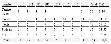Sendo assim, para a DEA, a amostra final deste estudo é composta por 263 observações, distribuídas, de forma desbalanceada, entre 2010 e 2017, que representa 69,2% da população. A distribuição amostral dos IFs por região e por ano/período está descrita na Tabela 1.