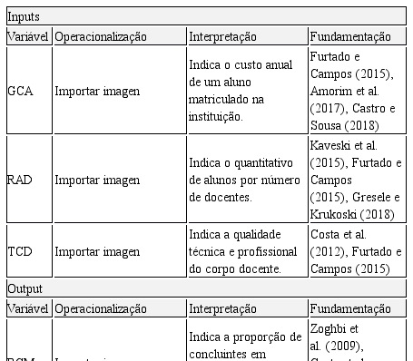 Para efetivação da análise de eficiência, a próxima etapa consiste em definir as variáveis de insumo (inputs) e de produtos (outputs). O Quadro 2 apresenta o detalhamento das variáveis do estudo, em que são utilizadas medidas (não) financeiras, para os inputs, e medidas de desempenho institucional, para os outputs.