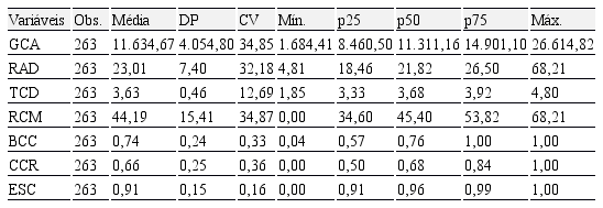A fim de proporcionar um panorama dos dados da pesquisa, apresentamos a análise descritiva das variáveis de input e de output, bem como os resultados dos níveis de eficiência – técnica (BCC e CCR) e de escala (ESC), que equaciona os modelos de eficiência técnica – conforme Tabela 2.