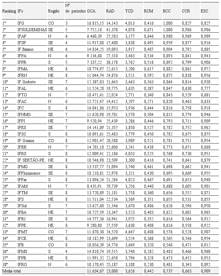 Esses resultados sugerem que as especificidades de cada instituição educacional – municipal, estadual, tecnológicas e militares – podem ser afetadas no nível de eficiência dos gastos públicos em educação. A divergência nos níveis de eficiência pode indicar a necessidade de um estudo identificando os fatores que possam determinar – majorando ou reduzindo – o nível de eficiência. Apresentamos, a seguir, o ranking dos IFs, utilizando como parâmetro a média de eficiência, com base no modelo de retornos variáveis escala (BCC), durante os períodos de dados disponibilizados pelas respectivas instituições de educação. O ranking está disposto na Tabela 3.