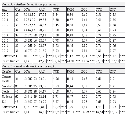 Posteriormente, aplicamos a análise de variância (Anova) para verificar a existência de diferença nas médias das variáveis de input e output, bem como dos escores de eficiência técnica (BCC/CCR) e de escala (ESC) ao longo do período analisado e entre as regiões. Os resultados estão descritos na Tabela 4.