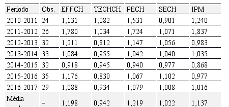 O índice pode assumir três resultados distintos: (1) quando o IPM > 1 indica que há melhoria de produtividade; (2) quando o IPM = 0 indica que não há mudança no nível de produtividade; e (3) quando o IPM < 1 indica que há perda de produtividade. As estimações foram realizadas através do software Data Envelopment Analysis (Computer) Program – DEAP (versão 2.1).