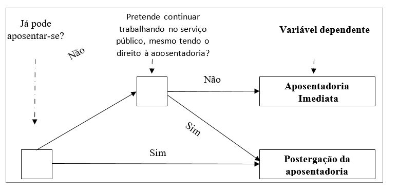 A variável dependente "postergação da aposentadoria" é dicotômica e seus valores representam dois grupos: o dos que têm preferência pela postergação da aposentadoria e o dos que têm preferência pela aposentadoria imediata. Os grupos foram levantados por meio da associação de duas questões. A classificação da preferência pela postergação da aposentadoria foi obtida, primeiramente, mediante a resposta “sim” à questão “Você já pode se aposentar?”. Os indivíduos que retornaram “não” foram divididos em dois subgrupos por intermédio da associação com a questão “Supondo que você já tenha adquirido o direito à aposentadoria, você pretende continuar trabalhando no serviço público?”. Os que se manifestaram com “Certamente sim” e “Provavelmente sim” foram adicionados ao grupo correspondente à postergação da aposentadoria. Já os indivíduos que responderam “Certamente não” e “Provavelmente não” foram classificados no grupo dos que têm preferência pela aposentadoria imediata. A Figura 2 representou a árvore de decisão, onde é possível observar o caminho seguido para a construção da variável dependente.
