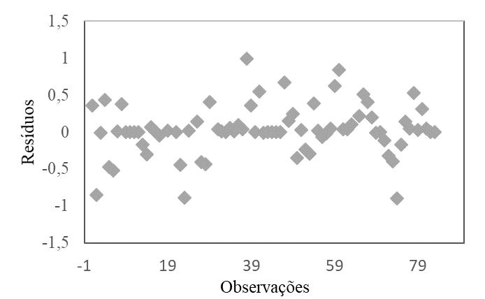 Para avaliar se as estimativas possuem as propriedades desejáveis de não viés, eficiência e consistência, conforme sugestão de Hair et al. (2005), foi analisado o gráfico de dispersão dos resíduos da regressão, que pode apresentar um diagnóstico de violação ou não desses pressupostos.