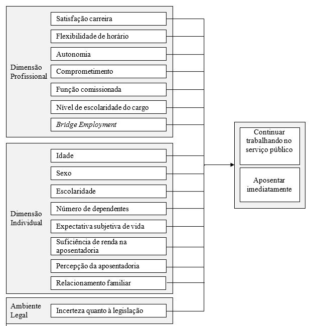 O modelo teórico passível de explicar a preferência pela postergação de aposentadoria para os servidores públicos de uma autarquia federal considerou as dimensões individual, profissional e o ambiente legal, como disposto na Figura 1, que aponta os preditores levantados a partir das pesquisas já realizadas relacionadas com a decisão de aposentadoria categorizados em suas respectivas dimensões.