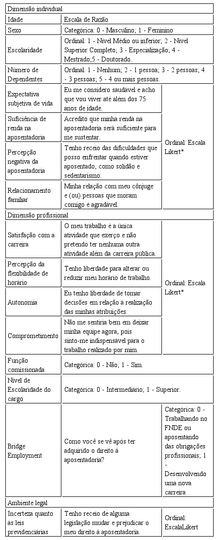 Como demonstrado pela Figura 1, na Dimensão Individual foram avaliados os fatores idade, sexo, expectativa subjetiva de vida, suficiência de renda e percepção negativa da aposentadoria. Na Dimensão Organizacional, por sua vez, as variáveis satisfação com a carreira pública, flexibilidade de horário, autonomia e exercício de função de assessoramento ou direção. Na Dimensão Ambiente Legal, a segurança da legislação previdenciária, não abordada empiricamente nas referências consultadas, porém considerada importante para os servidores públicos por Cardoso e Nogueira (2011).