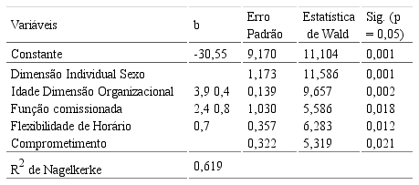 O R. de Nagelkerke indicou que as variáveis independentes ajustadas explicaram 61% da variância da variável dependente. Como forma de comparação, Gobeski e Beehr (2008) trabalharam com 31% de variância explicada, enquanto Pengcharoen e Shultz (2010) obtiveram 25% nesse indicador.