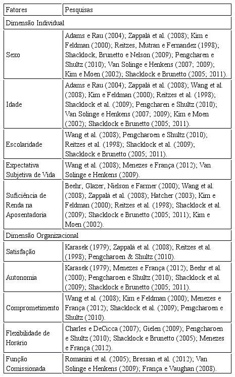 Alguns esforços já foram feitos na tentativa de levantar quais são os fatores mais relevantes para a decisão de aposentadoria dos indivíduos nas organizações. Wang et al. (2008) classificaram-nos em duas dimensões: a dimensão “micro”, englobando fatores relacionados às questões pessoais dos indivíduos, e a dimensão “macro”, envolvendo questões de contextos social, de trabalho, político e econômico. Wang & Shultz (2010), em sua revisão dos estudos sobre transição para aposentadoria, agruparam os fatores nas dimensões individuais, familiares, profissionais e socioeconômicos, resumindo as abordagens das pesquisas sobre os preditores de aposentadoria.