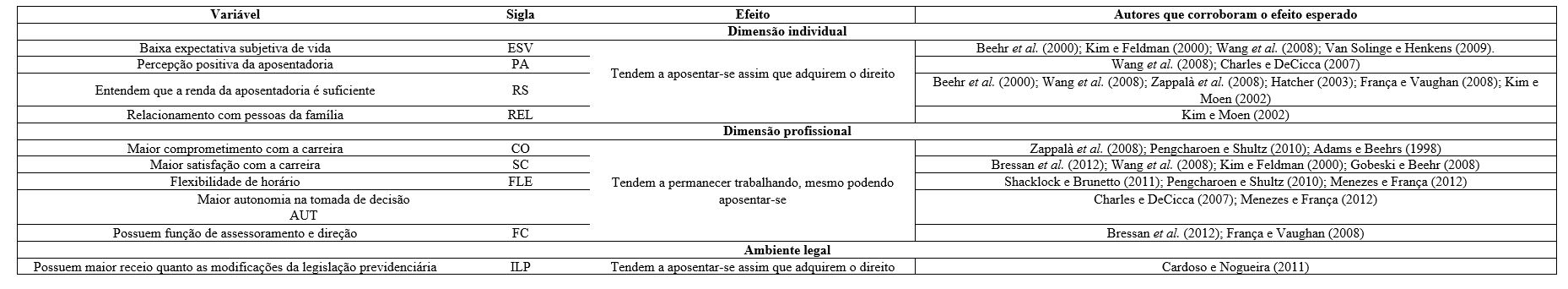 Outros estudos brasileiros podem dar suporte teórico à escolha das variáveis influentes na decisão de aposentadoria, como, por exemplo, o de Cintra, Ribeiro e Andrade (2010), que apontou a necessidade de os trabalhadores aposentados voltarem à atividade para complementar a renda, ressaltando a relevância do aspecto financeiro para tal decisão no contexto nacional. Outros fatores também foram apontados como relevantes para a postergação da inatividade no contexto brasileiro. Dentre eles, a satisfação (Bressan et al., 2012), o status social (Romanini, Xavier, & Kovaleski, 2005) e o papel que o trabalho desempenha na construção da identidade pessoal (Khoury, Ferreira, Souza, Matos, & Barbagelata-Góes, 2010). Um resumo das variáveis preditoras da aposentadoria testadas em vários estudos empíricos encontra-se no Quadro 1.