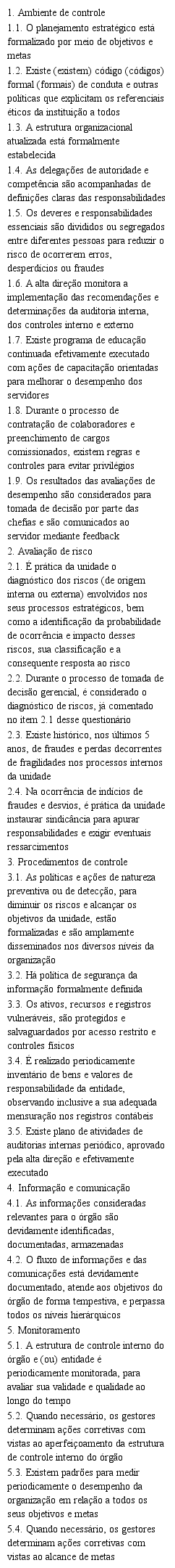 Na autoavaliação, os órgãos atribuem notas de 1 a 4 (correspondendo a nunca, raramente, com frequência e sempre, respectivamente) considerando as afirmativas. A norma estabelece que as respostas aos aspectos determinam o nível de controle interno como satisfatório (3 ≤ Nota ≤ 4), razoável (2 ≤ Nota < 3) e insatisfatório (1 ≤ Nota < 2). Essa avaliação é um componente do risco dos órgãos levado em conta para realização de futuras auditorias. Nesse ponto, cabe mencionar que os estudos de Cannavina e Parisi (2015) e Souza e Silva (2016) também foram desenvolvidos a partir dos quadros de autoavaliação dos sistemas de controles internos. O primeiro avalia a percepção dos gestores dos órgãos da Administração Pública Direta do Poder Executivo Federal; o segundo com gestores das Unidades da Federação, ambos reportados ao Tribunal de Contas da União (TCU). Nota-se que a literatura ampara essa métrica de avaliação.