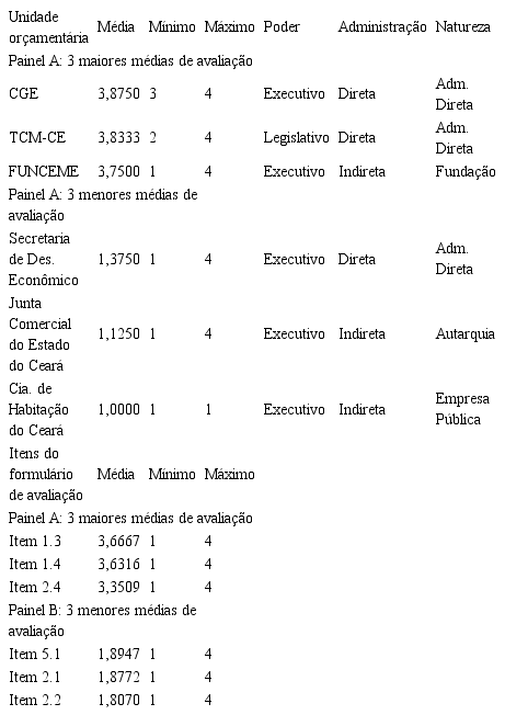 O primeiro estrato da Tabela 1 aponta dois órgãos de atividades contábeis de fiscalização e controle com melhor média de avaliação, a Controladoria e Ouvidoria Geral do Estado (CGE) e o Tribunal de Contas dos Municípios (TCM-CE). Destaca-se que, embora a Controladoria e a Ouvidoria possuam diferentes funções que se complementam, essa última não detém papel em atividades contábeis, coexistindo no mesmo órgão jurisdicionado da Controladoria. Tendo em conta os órgãos de melhor avaliação, o resultado parece condizente com a sua atuação. A Fundação Cearense de Meteorologia e Recursos Hídricos (FUNCEME) é um órgão estadual voltado à pesquisa e desenvolvimento em meteorologia que, apesar de não relacionado com as atividades de controle próprias da contabilidade, apresentou a terceira melhor média.