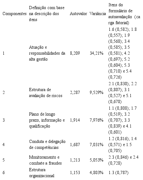 Aplicando-se o método de extração por componentes principais, assumindo-se autovalores maiores que 1,000 e a rotação Varimax para os fatores, foi possível extrair 6 componentes, sendo 68,6% a variância total explicada. A Tabela 2 sumariza os resultados da análise fatorial incorporando os aspectos da autoavaliação dos controles internos aos fatores indicados.