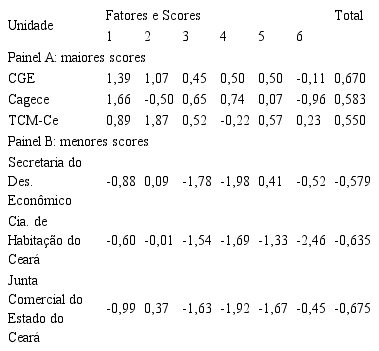 O ranking ordena os órgãos investigados segundo a avaliação da estrutura de controle interno. Ele é obtido pela soma dos valores de cada fator ponderada pela sua variância. Assim, podem ser identificados os órgãos jurisdicionados do TCE/CE com melhor avaliação do controle interno por meio dos fatores mais promissores para avaliação da estrutura de controle interno (autovalor > 1,000).