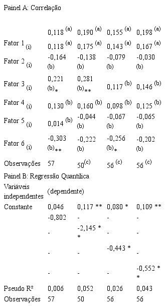 A Tabela 4 apresenta os resultados dos testes de correlação e da estimação dos modelos quantílicos considerando a avaliação da estrutura de controle interno e o tamanho dos órgãos. Não há correlação estatisticamente significante entre o score de avaliação do controle interno dos órgãos e as proxies de tamanho dos órgãos. Contudo, há correlação estatisticamente significante analisando-se cada componente, fato que ratifica a importância da análise fatorial.