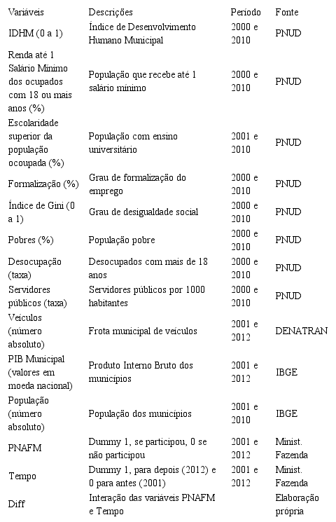 Para Angrist e Pischcke (2008), o pressuposto-chave é que o comportamento das variáveis de interesses seria o mesmo para todos os municípios na ausência do tratamento. O tratamento induz um desvio na trajetória e, embora o grupo tratado possa diferir do controle, essa diferença seria explicada pelas características dos municípios que jogam o papel de efeitos inobserváveis nos dois períodos. A tabela 1 apresenta as covariáveis que serão utilizadas no painel.