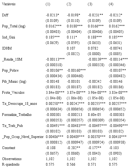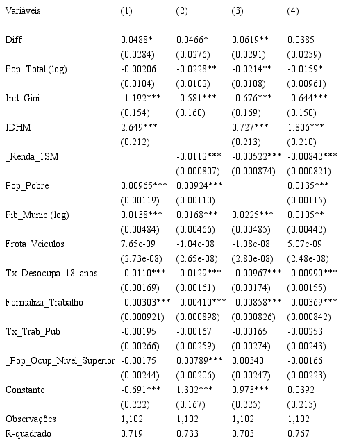 Erros padrão entre parênteses: *** p<0.01, ** p<0.05, * p<0.1)