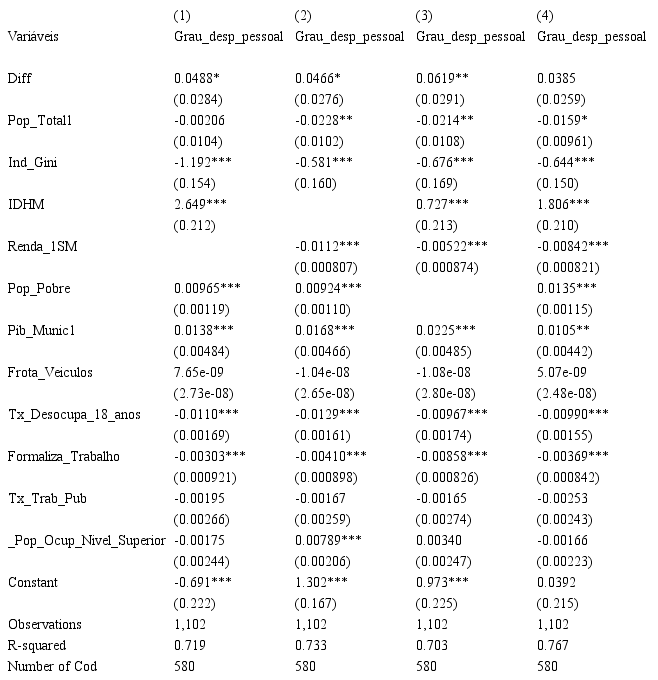 As variáveis sobre a burocracia municipal mostram que contingentes maiores de pessoas com educação superior aumenta as possibilidades arrecadatórias (p < 0.01 em todos os modelos) e que taxas maiores de servidores públicos reduzem o incremento dos tributos próprios, também com coeficiente de p<0.01.