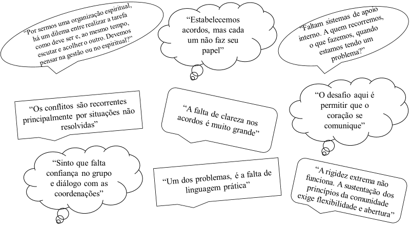 Será que os desafios mencionados pelas coordenações são os mesmos percebidos pelos membros da comunidade? Esta pergunta ressoava em Jonas, cotidianamente. Ele decidiu que o caminho seria entrevistar os membros imersos diariamente na rotina da FIS. Após conversar com 30 voluntários e analisar o conteúdo desses diálogos, Jonas notou que existem ponderações que se repetem, formando padrões expressos pelas seguintes falas descritas na Figura 2.