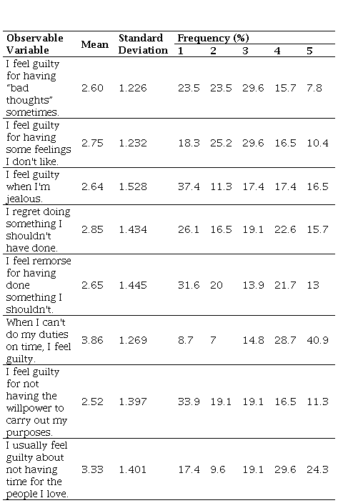 It is also observed that 47% of respondents do not feel guilty for having bad thoughts, and 43.5% also do not feel guilty for having some feelings they would not like, with a large percentage, about 48.7% said they did not if they feel guilt or remorse for feeling jealous. It appears that, in general, respondents' culpability is low, except for variables that involve not having time for family (average 3.33) and not being able to fulfill their obligations (average 3.86).