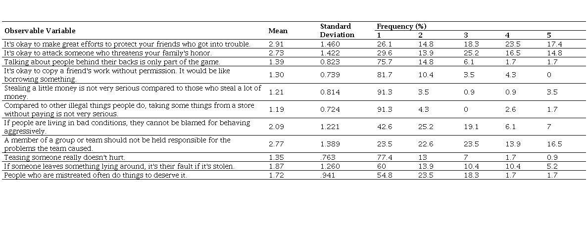 Regarding the pre-candidate’s moral disengagement, it appears that the respondents show a very low propensity (total average of 1.89). However, it is noteworthy that issues that attack family or friends show a slightly greater propensity of some respondents to moral disengagement; 40.9% of respondents said it is okay to make great efforts to protect their friends who got into trouble. Furthermore, 43.5% show that it is okay to attack someone who threatens a family's honor. Table 3 analyzes differences between groups.
