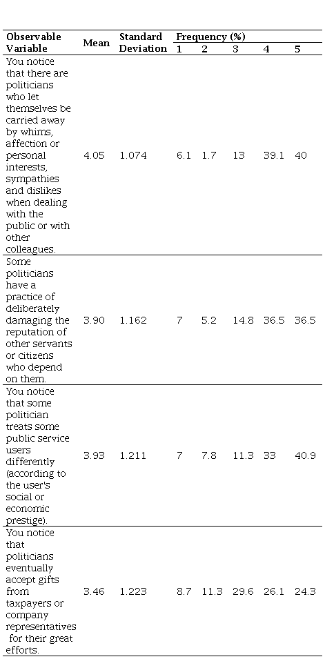 In analyzing the dimension perception of unethical decision-making, 79% of respondents believe that other politicians let themselves be carried away by whims, passions, or personal interests in dealing with the public or other colleagues (average 4.05). 73% believe that other politicians have deliberately damaged the reputation of other servants or citizens who depend on them. Respondents believe that other politicians treat public service users differently, according to the user's social or economic prestige (average 3.93). Thus, it appears that respondents perceive unethical decisions by 'other' politicians (average 3.83).