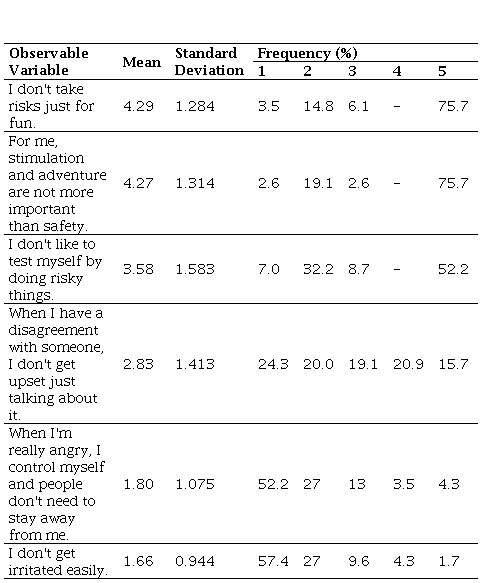 In the analysis of the self-control dimension, it is verified that, in general, the sample claims to have good self-control. On average, 20% of respondent’s pre-candidates are at risk of having fun, and they believe that stimulation and adventure are more important to them than safety. They also show that they have reasonable control over their moods and attitudes when they are angry. However, they say they get irritated with some ease. However, in general, it appears that the sample disagreed with the statements that incite deviant behavior.