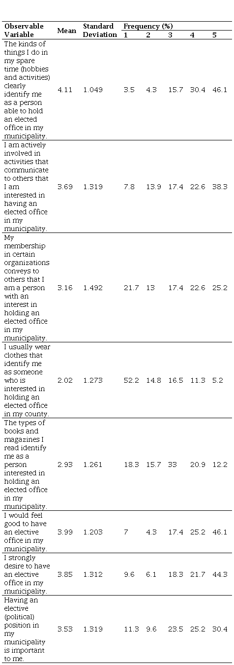 Regarding the pre-candidate’s moral identity, it was identified that most of the respondents' pre-candidates believe that they do things in their free time (hobbies and activities) that identify them as a person able to hold an elective position in their municipality. However, 60.9% are actively involved in activities that communicate interest in having an elective office. For moral identity, 71.3% said they would feel good about having an elective office, 66% strongly desire to have one elective office in their municipality, and 55.6% of respondents said that having an elective office is very important to them - an average of 3.53. The analysis of these variables shows that a large part of the respondent pre-candidate desire and demonstrate the desire to hold an elective position in their municipality.