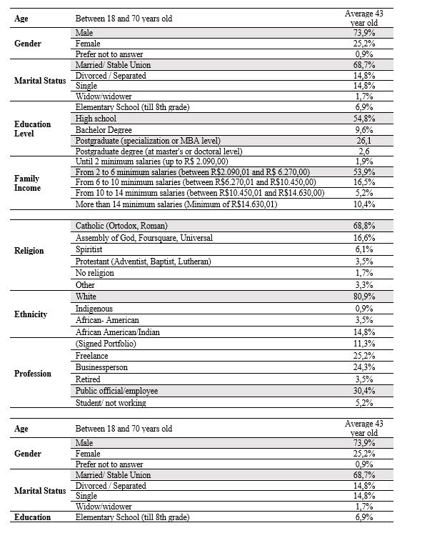 As it can be seen, the sample is composed mainly of men (73.9%), married or in a stable relationship (68.7%), Catholics (68.8%), white (80.9%), with education divided between complete high school (54.8%), postgraduate studies at the specialization level and MBA (26.1%), and the average age of 43 years. These data approximate the average profile of candidates in the 2020 election in Brazil. Data from the Superior Electoral Court, published by the G1 (2020), show that the average profile of the candidate in the elections is a man, 46 years old, black, married, and with high school education. The issue that differs in this sample is ethnicity, as our sample is predominantly white, which may be characteristic of the region used as the locus.
