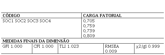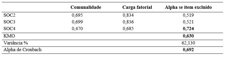 O primeiro procedimento de AFE aponta a matriz de componente rotativa com apenas um fator, indicando que os itens da dimensão estão medindo o mesmo construto. O item SOC1 apresentou comunalidade abaixo de 0,4, confirmando, assim, sua exclusão. A extração do alpha apresenta 0,663 e a exclusão do SOC1 provoca seu aumento, corroborando com a decisão de exclusão do item.