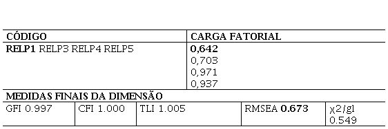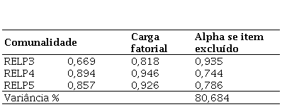 Para a realização de uma segunda rodada de AFE e a extração do alpha, optou-se pela exclusão dos itens RELP1, RELP2 e RELP6. Após a exclusão, a matriz de componente rotativa apresentou apenas um fator. Os itens apresentam comunalidade e carga fatorial dentro dos limites da pesquisa. A variância de explicação do fenômeno e o alpha de Cronbach apresentaram cargas maiores. Mesmo com a exclusão de RELP3 indicando a elevação do alpha, optou-se pela não exclusão do item, uma vez que o alpha apresenta valor dentro do estabelecido para a pesquisa, conforme a Tabela 5.