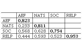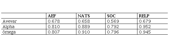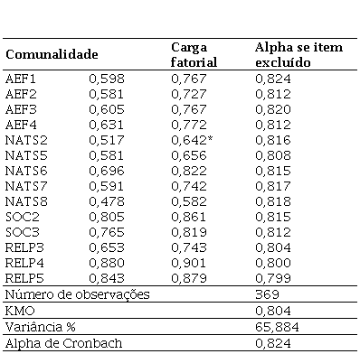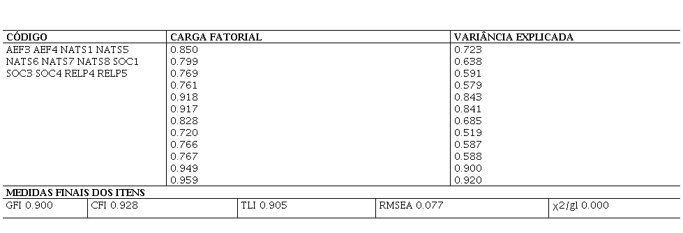 Para ajuste dos índices foram excluídos os itens AEF1, AEF5, SOC2 e RELP3 por apresentarem cargas fatoriais abaixo de 0.700 e nível de explicação do fenômeno abaixo de 0.500. A Tabela 11 apresenta o conjunto de itens que serão submetidos à validade e confiabilidade.