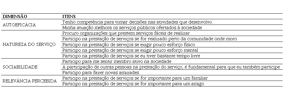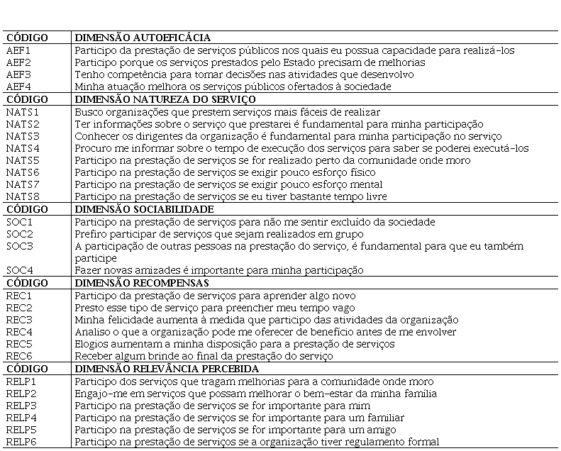 A escala inicial era composta de 28 itens e cinco dimensões. No entanto, a escala final tem 12 itens e quatro dimensões. Os resultados encontrados nesta pesquisa servem para corroborar com pesquisas realizadas em outros países, mostrando que os cidadãos engajados na CBP não o fazem com o intuito de receber elogios, não estão buscando felicidade ou prestando serviços em troca de benefícios materiais. Esses aspectos restam evidenciados nos itens da escala.