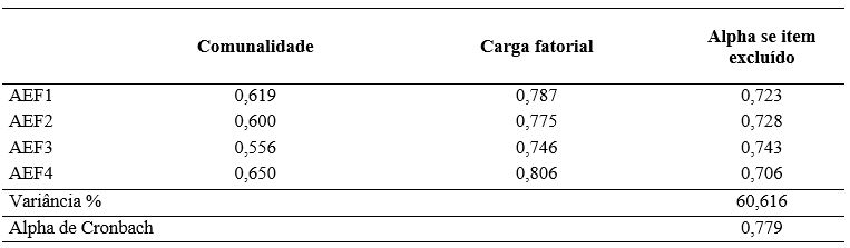 Os itens da dimensão autoeficácia apresentaram correlação entre 0,3 e 0,9 e KMO (0,777), sinalizando boa correlação e boa adequação dos itens da dimensão. Todos os itens apresentaram comunalidade e carga fatorial maior que 0,4, e a variância de explicação do fenômeno foi superior a 60%. A extração do alpha apresenta 0,779 e não sofre alteração com a exclusão de algum item, conforme Tabela 2.