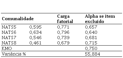 A exclusão dos itens provocou um aumento do KMO (0,750) e do alpha (0,734), indicando a adequação dos itens da dimensão. Todos os itens da dimensão apresentam índices dentro do estabelecido para a pesquisa, conforme Tabela 3.